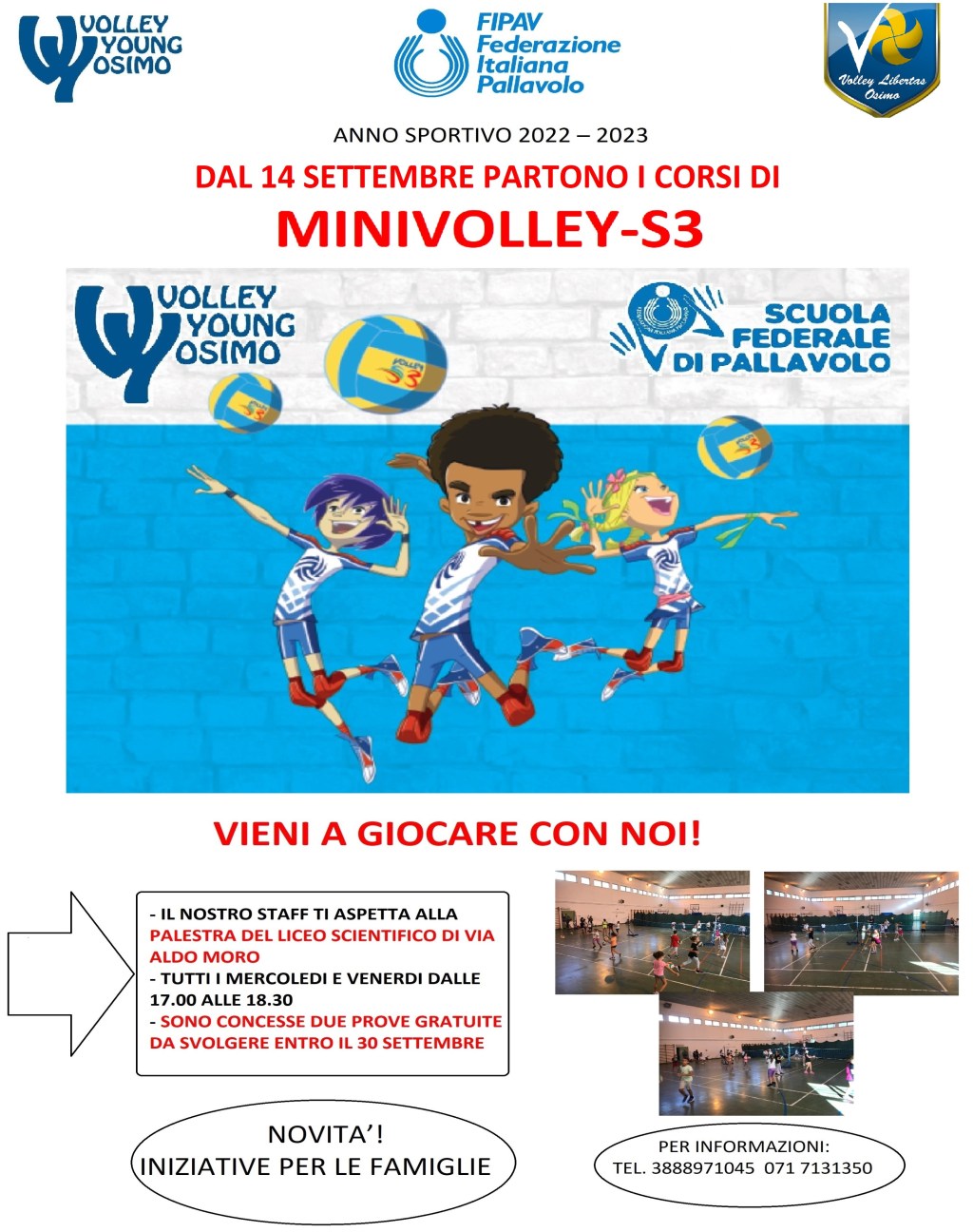 Con l’avvio della nuova annata sportiva ripartono i corsi del minivolley della Volley Young Osimo. La società osimana, sempre in prima linea per quanto riguarda l’attività giovanile pallavolistica, dal 14 settembre vi aspetta con il suo staff altamente qualificato per iniziare questo percorso insieme in uno sport, la pallavolo, altamente divertente e formativo.